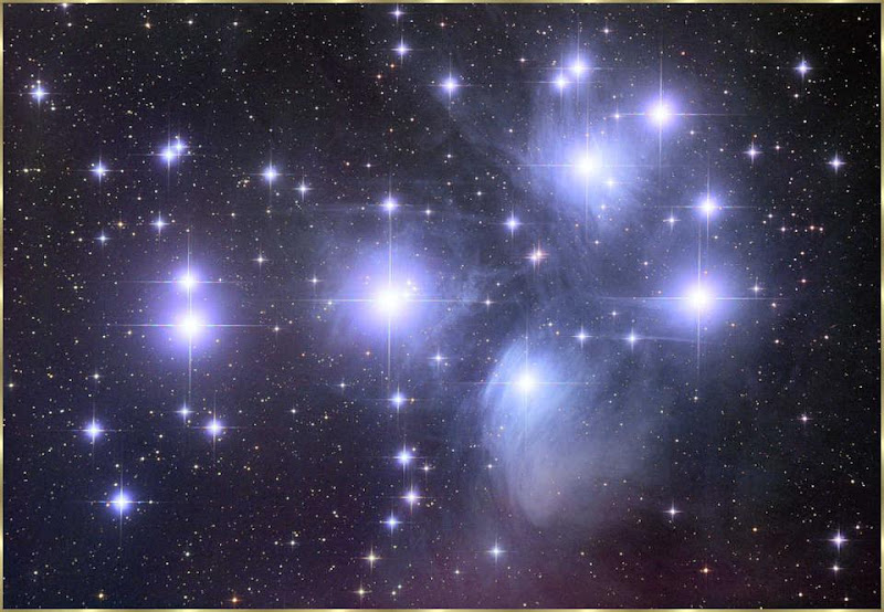 A nebulosidade das Plêiades é provocada por um encontro entre um enxame aberto de estrelas e uma nuvem molecular.